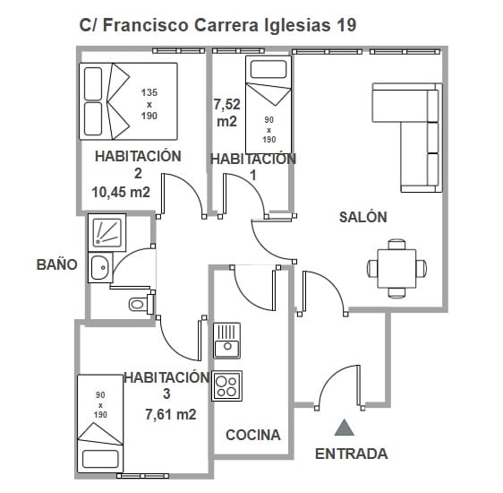 Piso con 3 habitaciones amplias y luminosas, una de ellas equipada con una cama doble de 135 cm (habitación 1), perfecta para el descanso. El piso dispone de 1 baño completo, un salón acogedor y una cocina totalmente equipada, ofreciendo todas las comodidades necesarias para una vida confortable.
